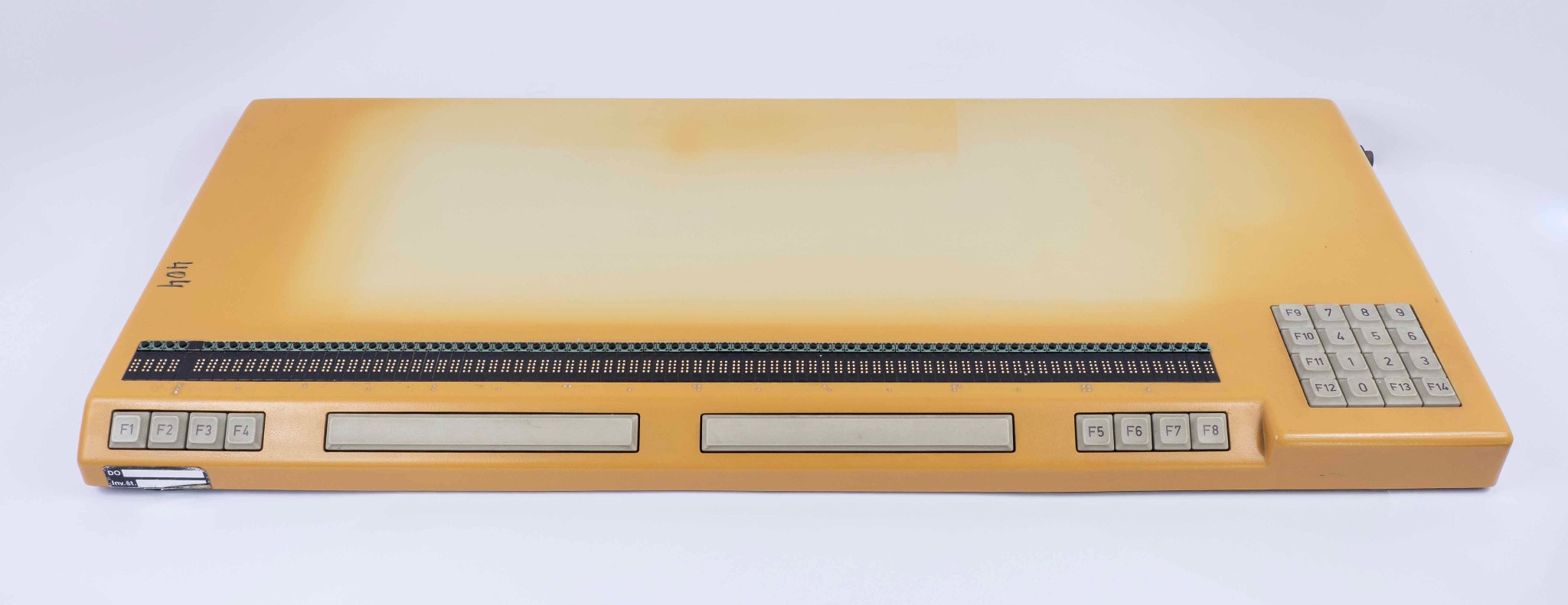 Opis: Rumenorjava naprava, imenovana brajeva vrstica, je dolga 40 cm, široka 30 cm, visoka 4 cm. Nad vrstico z brajico so tipke za kurzor. Na levi strani naprave so štiri funkcijske tipke, na skrajni desni strani pa je 16 tipk s številkami. Ob desnem boku je tipka za vklop in izklop. Spredaj pred brajevo vrsto se nahajata dve dolgi vodoravni tipki, ki služita za pomikanje po vrstah zaslona ali dokumenta. Uporabljeni materiali so kombinacija plastike in kovine, brajeve pike pa so keramične iglice.