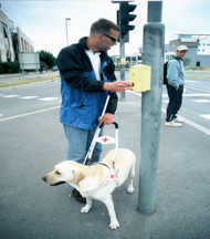 Slika prikazuje zvočni semafor, ki slepim s piskom na gumb z zvočnim signalom nakaže zeleno luč oz. možnost prečkanja ceste.