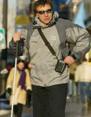 Slika prikazuje osebo z napravo Treker, ki s pomočjo GPS navigacije in prednaloženih kart omogoča orientacijo slepih v urbanem in ruralnem okolju.
