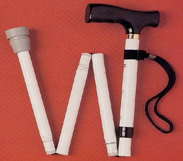 Slika predstavlja zložljivo belo palico, primerno predvsem za starejše, ki potrebujejo oporo pri hoji.
