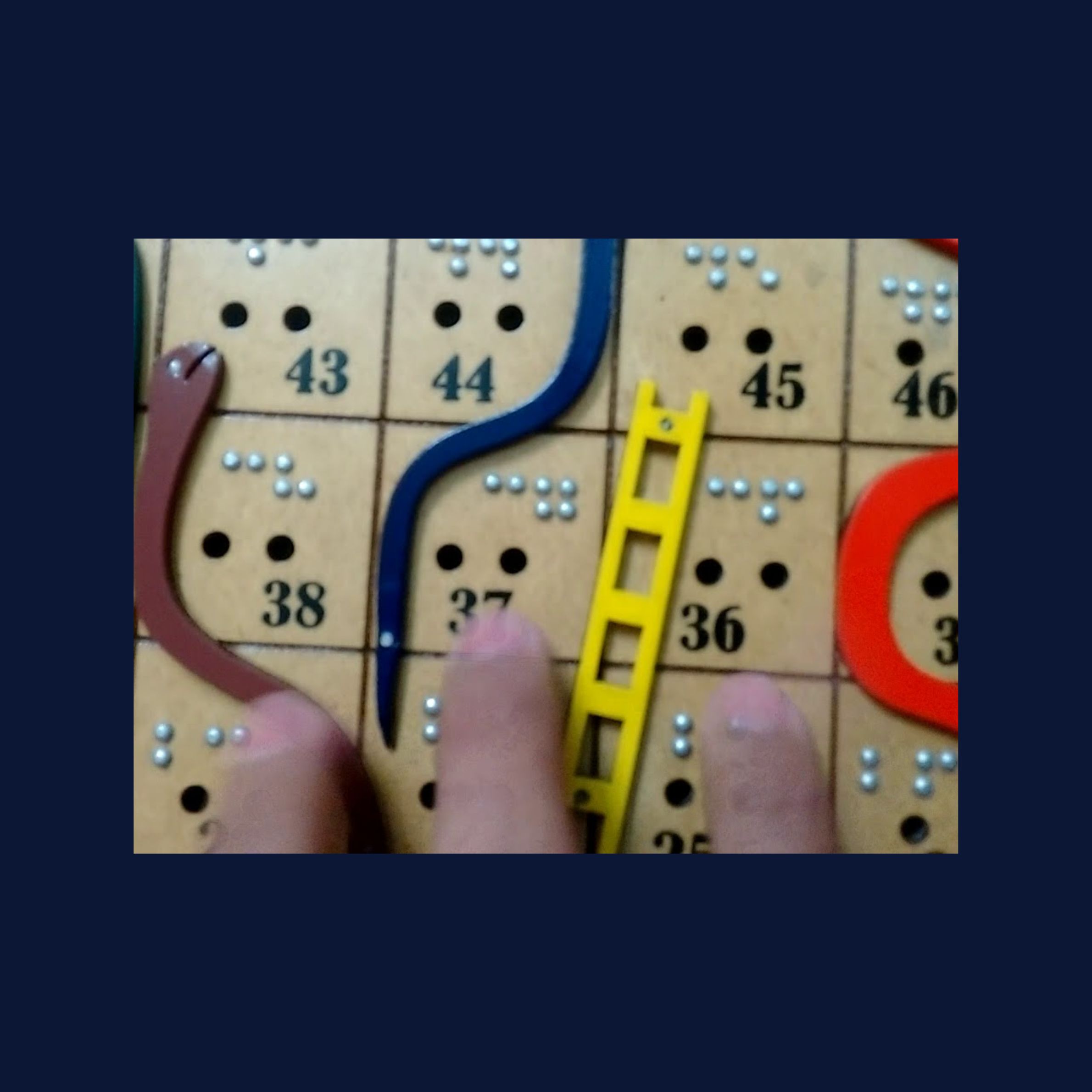 Na sliki je del igralne deske igre Kače in lestve. Igralna plošča je lesena. Na njej je več barvnih kač in lestev. Polja so oštevilčena, tudi v brajici. Na vsakem polju sta dve luknjici za možička. Na spodnjem delu slike se vidijo trije prsti osebe, ki tipa igralno ploščo.