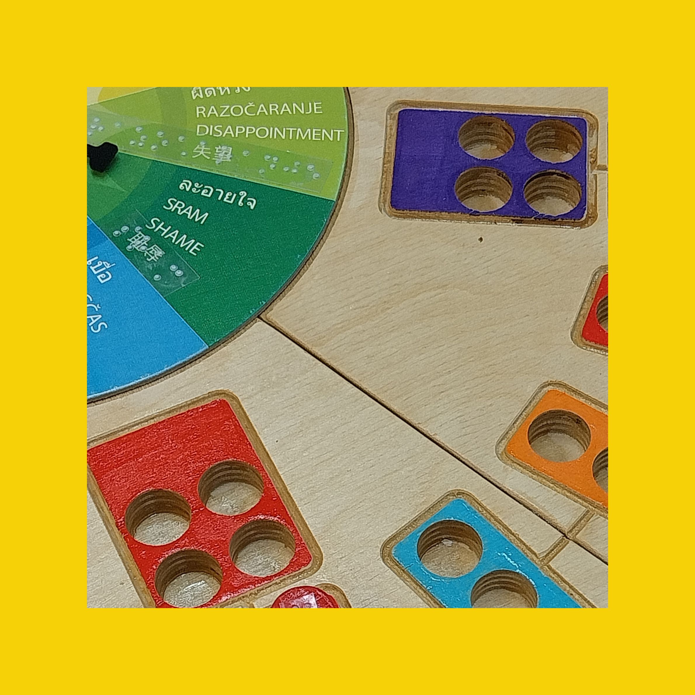 Na sliki je del igralne plošče Vrtiljak čustev. Vidijo se raznobarvna polja in vrtiljak čustev. Na vrtiljaku čustev se vidijo zapisi v brajici. Zapisi v brajici se vidjo slabo, ker so na prozorni foliji.