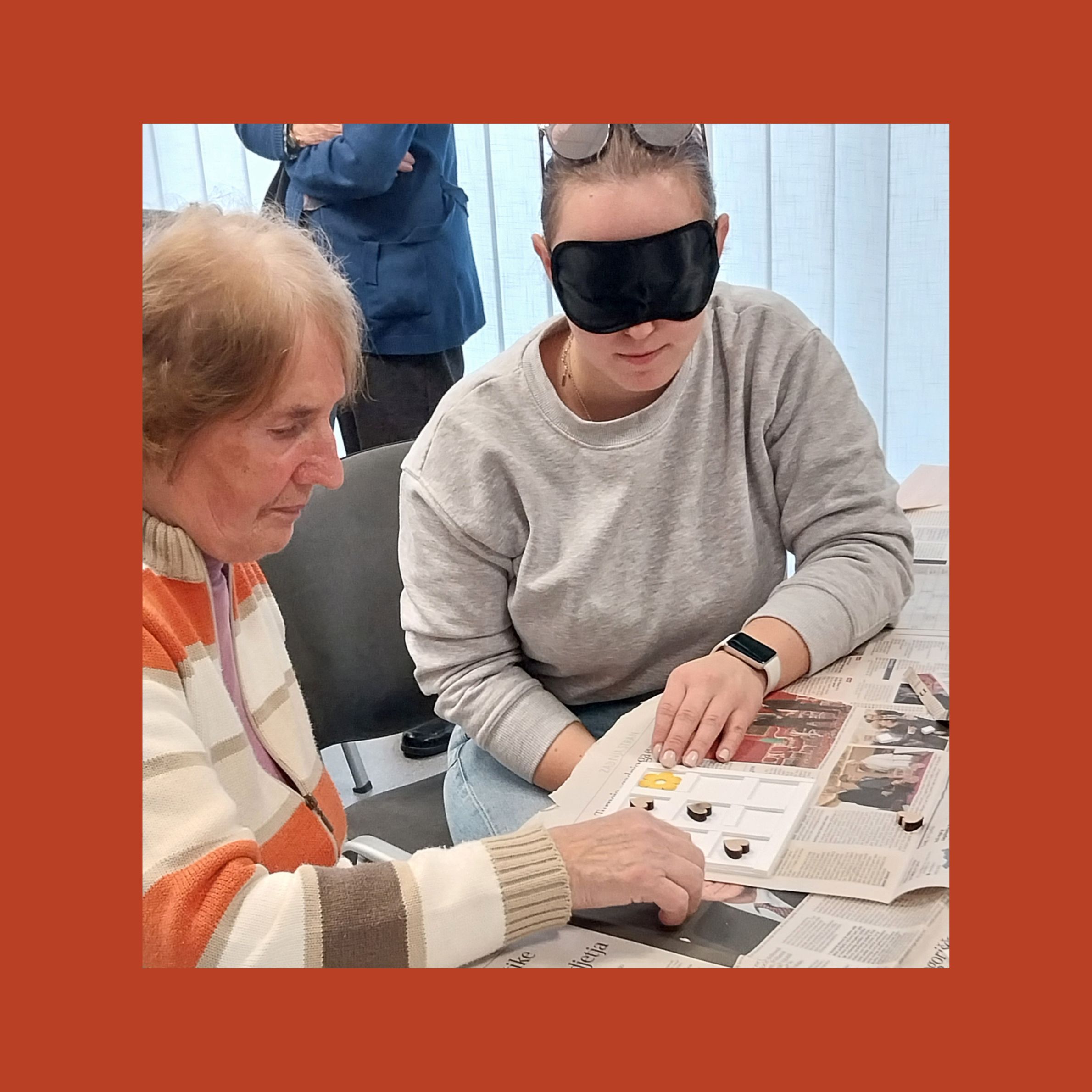 Na sliki sta 2 ženski, ena mlajša in ena starejša. Obe sedita za mizo. Mlajša ima na očeh temna očala, zaradi katerih ne more videti. Na mizi je časopisni papir. Na njem, med obema ženskama, pa je ročno izdelana igra: Tri v vrsto. Ženski igrata to igro.