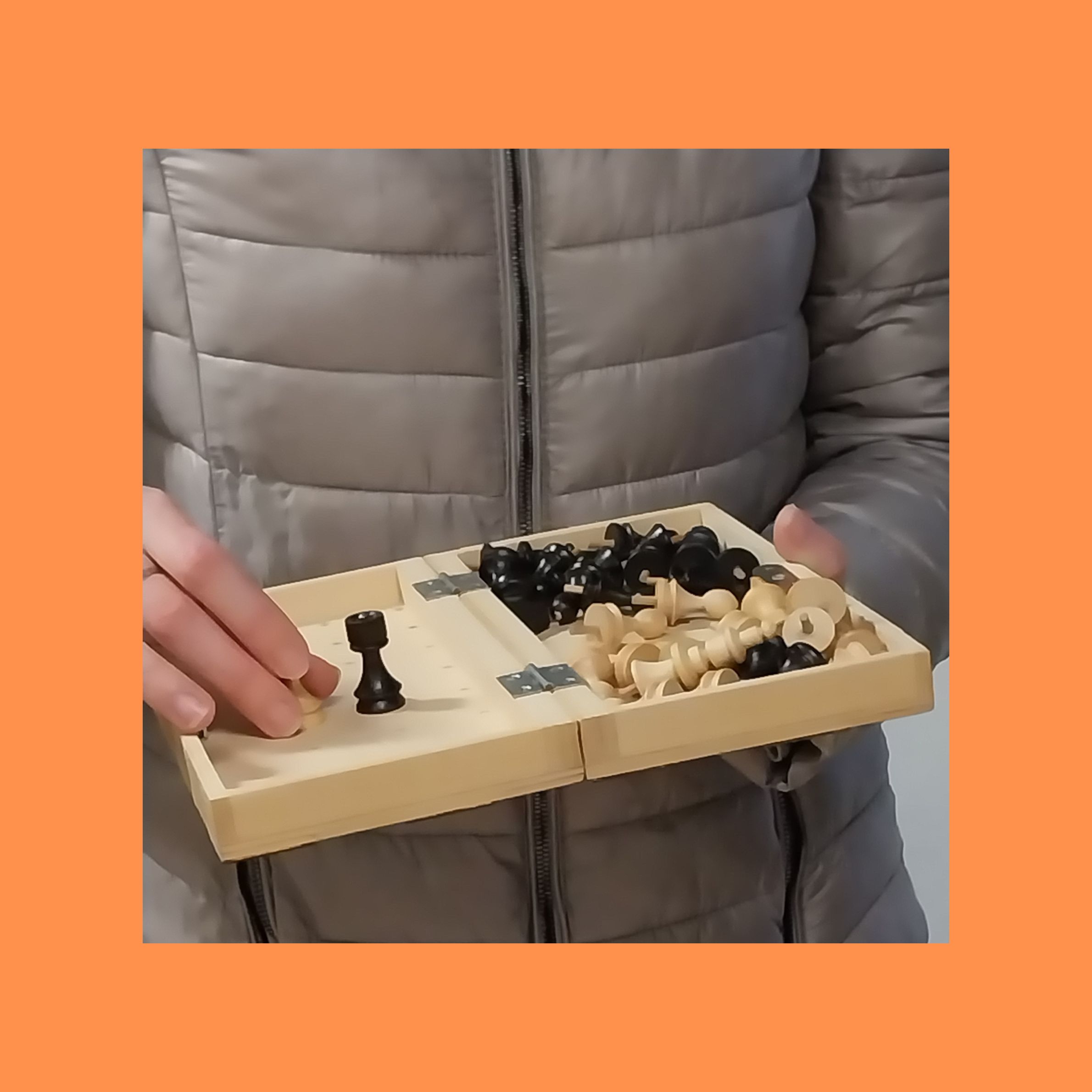 Na sliki je ženska v bež bundi. Vidi se njeno telo in roke, obraz in noge se ne vidijo. V rokah drži odprt šah, prilagojen slepim in slabovidnim.