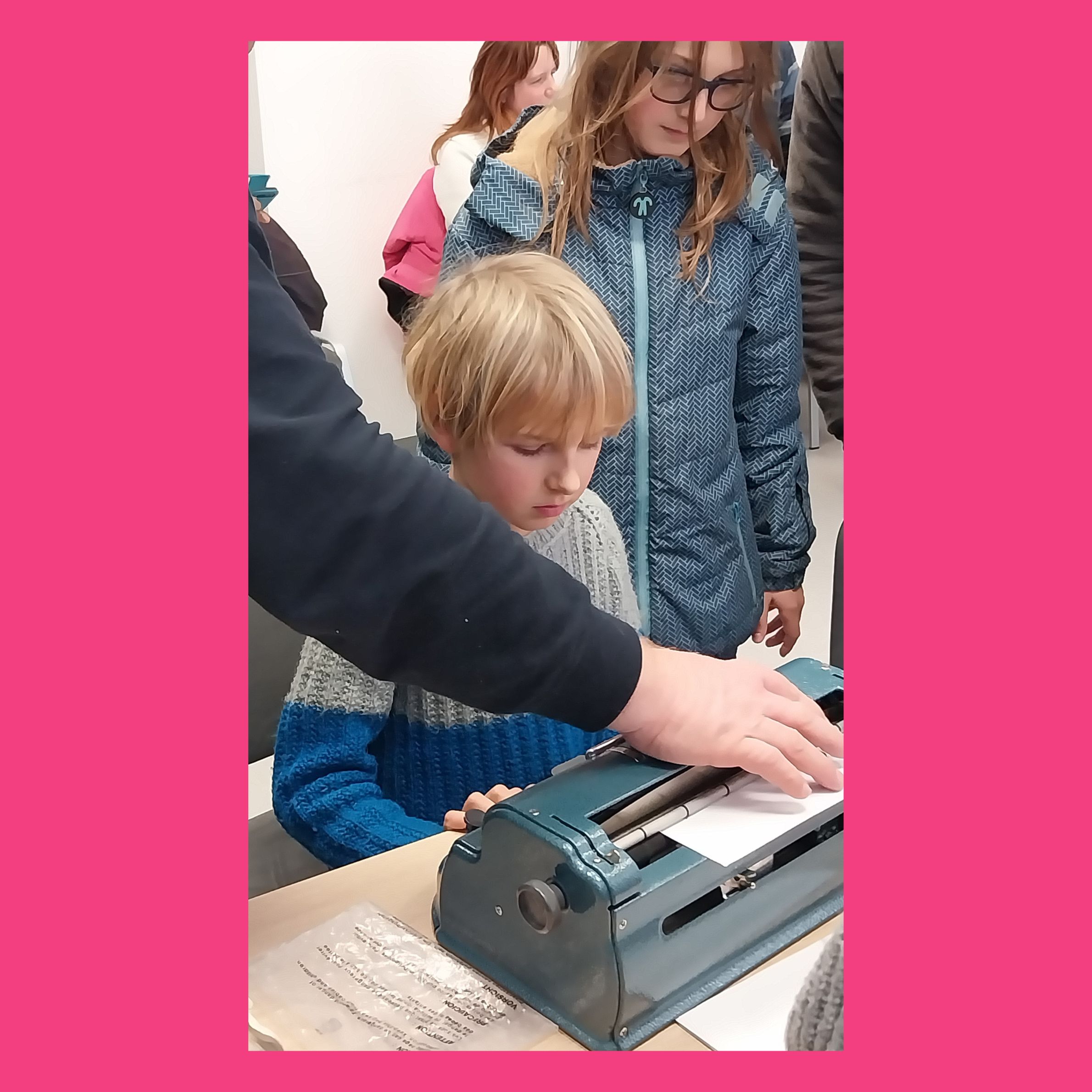 Na sliki sta 2 otroka, ki opazujeta brajev pisalni stroj. Vidi se tudi roka odraslega, ki bere kar je bilo na stroj napisano.