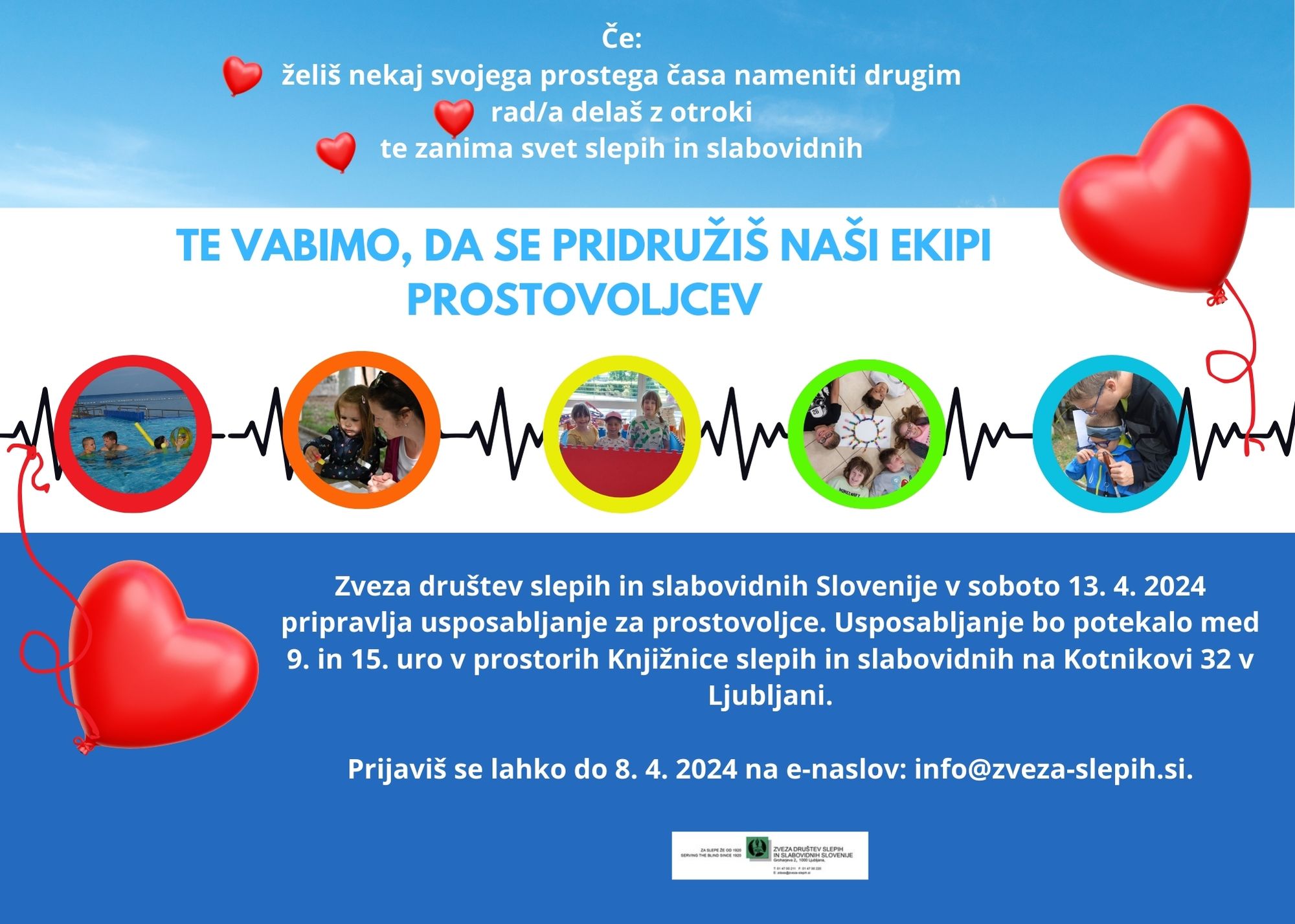 Zato 13. 4. 2024 v prostorih Knjižnice slepih in slabovidnih Minke Skaberne na Kotnikovi 32 v Ljubljani, pripravljamo usposabljanje za prostovoljce, ki bi se nam želeli pridružiti.