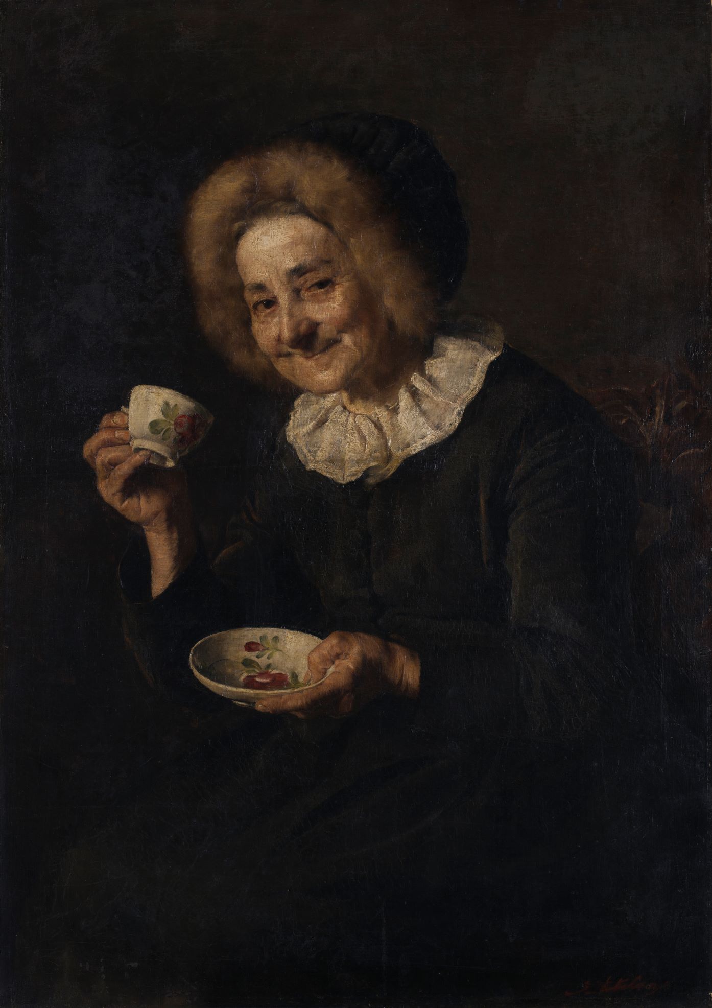 Stara ženica sedi na lesenem stolu z izrezljanim naslonjalom, ki se ga le deloma vidi na sredini desnega roba slike. Na sliki ne vidimo njene cele postave, temveč je naslikana le do kolen. Gospa je postavljena v temno sobo pred črno-rjavo ozadje. Pravzaprav je večina slike v temnih rjavkastih tonih, izstopajo le njen svetel obraz in roke, v katerih drži belo skodelico in porisan krožniček.